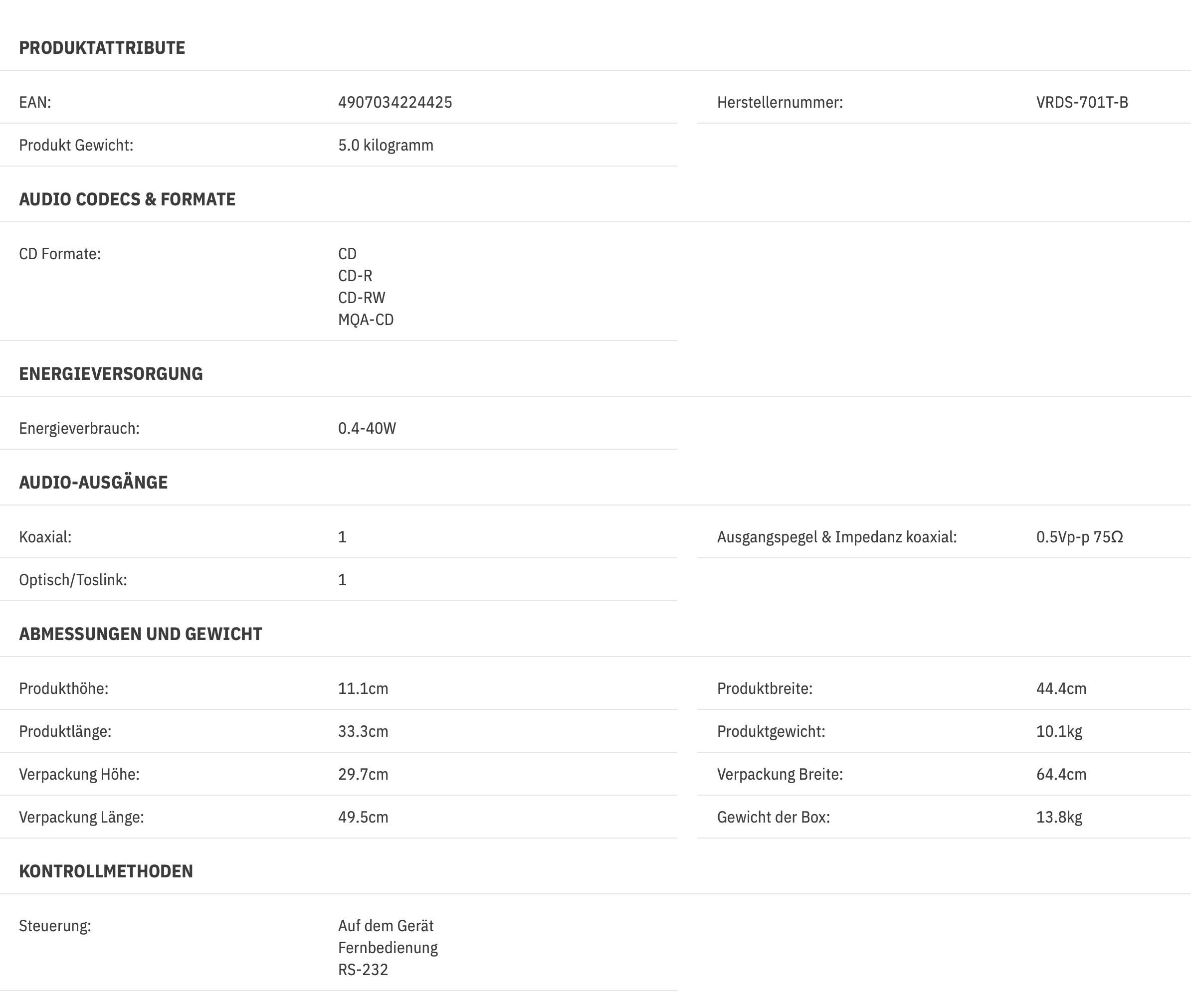Der VRDS-701T verfügt über einen eingebauten MQA-Core-Decoder und kann MQA-CDs mit 88,2 kHz digital ausgeben. In Verbindung mit einem DAC, der über eine MQA-Rendering-Funktion verfügt, ist auch die Wiedergabe mit MQA-Volldecodierung möglich.