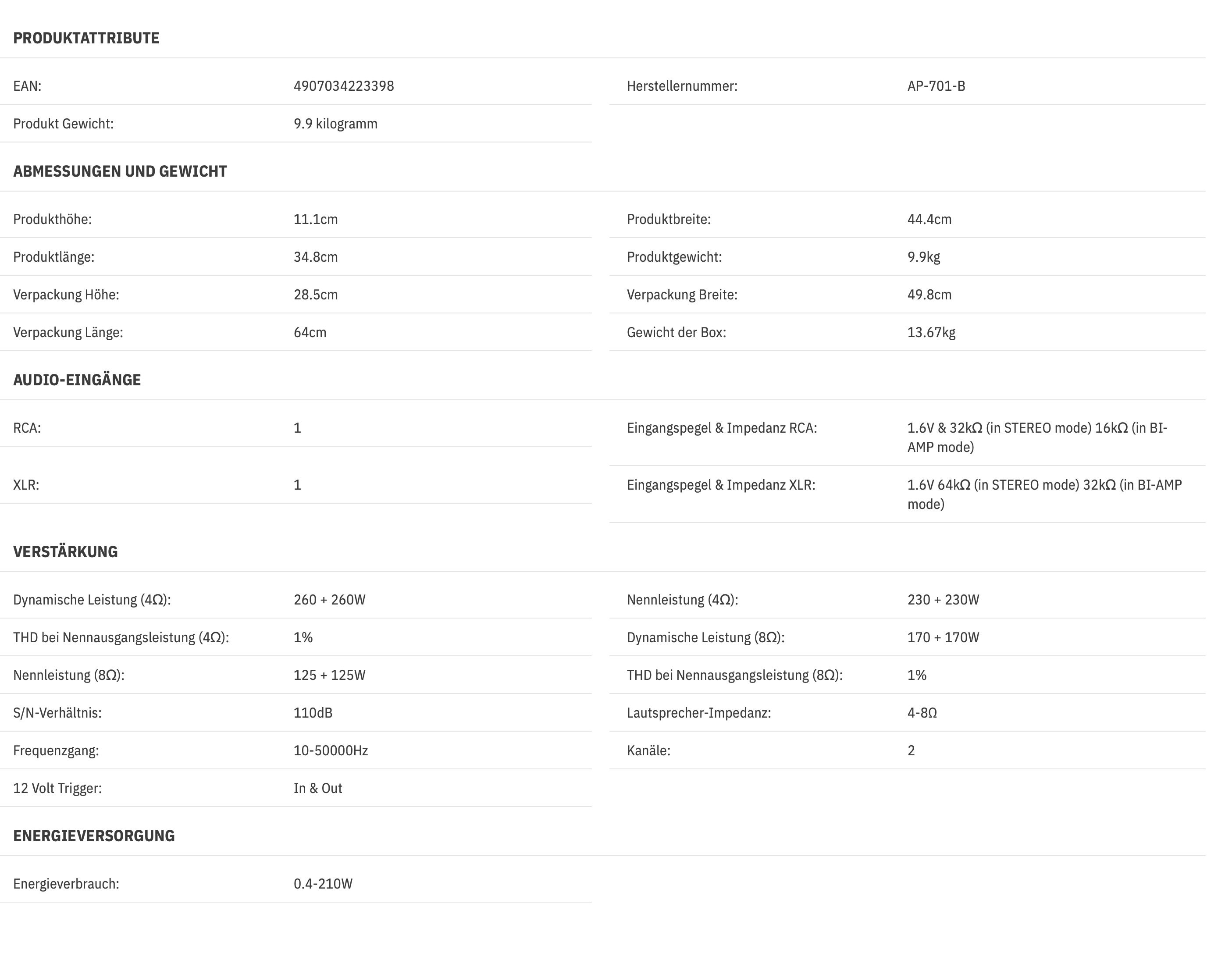 - Hohe Leistung mit einem praktischen Maximum von 260 W + 260 W (4 Ω)/170 W + 170 W (8 Ω)