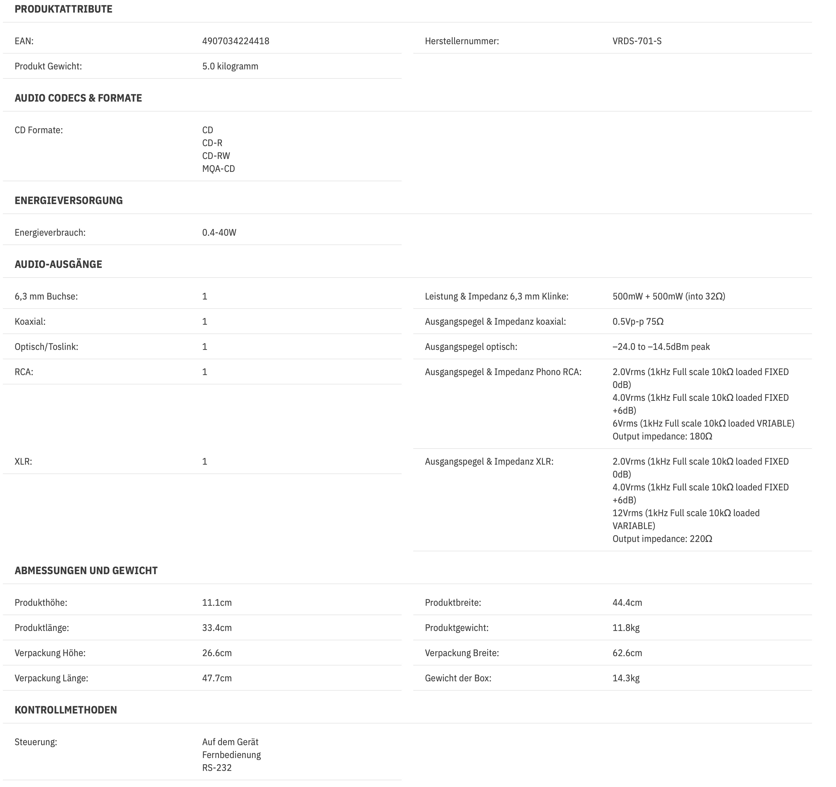 Für den digitalen Eingang ist ein USB Typ-C Anschluss vorhanden. Der VRDS-701 ist viel mehr als ein CD-Player. Wenn er über USB an einen Computer angeschlossen ist, kann er als USB DAC verwendet werden und ermöglicht so den Genuss der Computer-Audio-Welt mit hochauflösenden Audioquellen